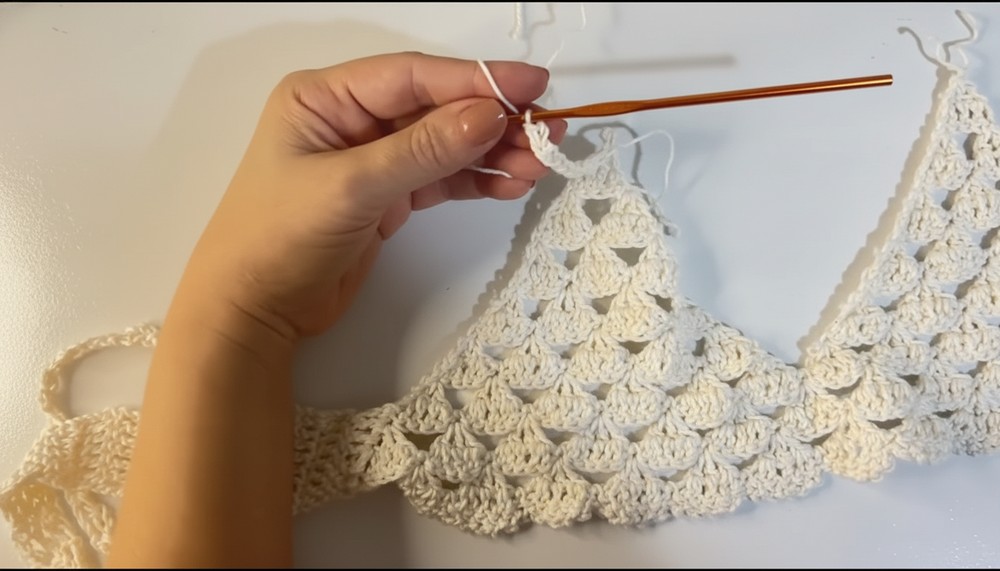 Triangle Stitch (Ponto Triângulo): The main stitch used for the cups is a rhythmic pattern of cluster rows and solid fill rows, which automatically creates the perfect triangle shape.