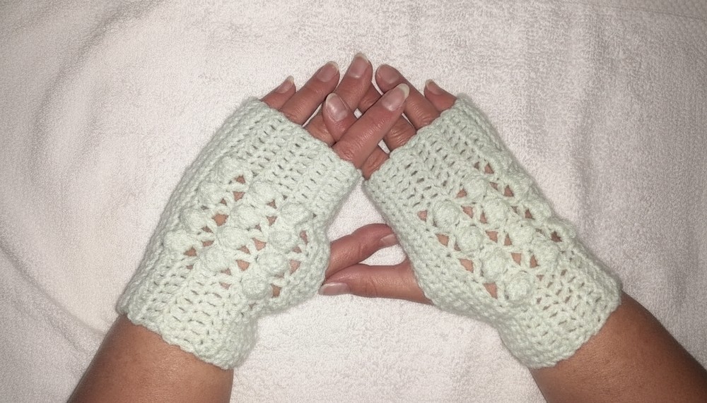 - For shorter gloves, reduce the row count after completing bobble layers.