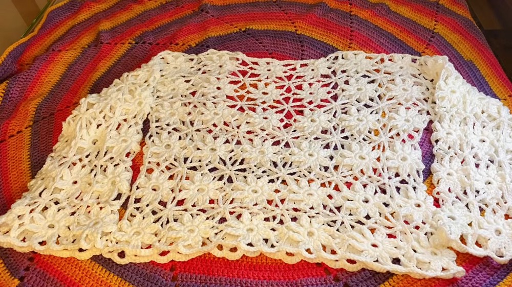 - Once all squares are attached, single crochet around the top’s edges (including the neckline, sleeves, and bottom hem) to create a neat finish.