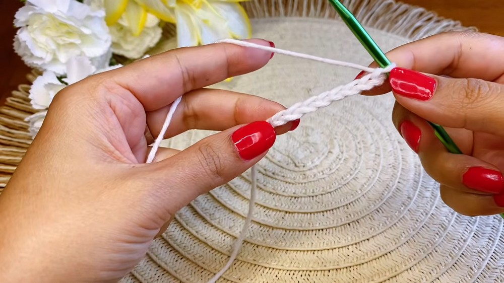 - Yarn over, pull through all loops, chain 1, and chain 5.