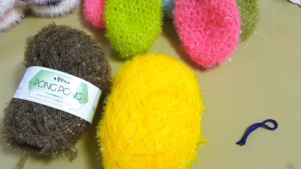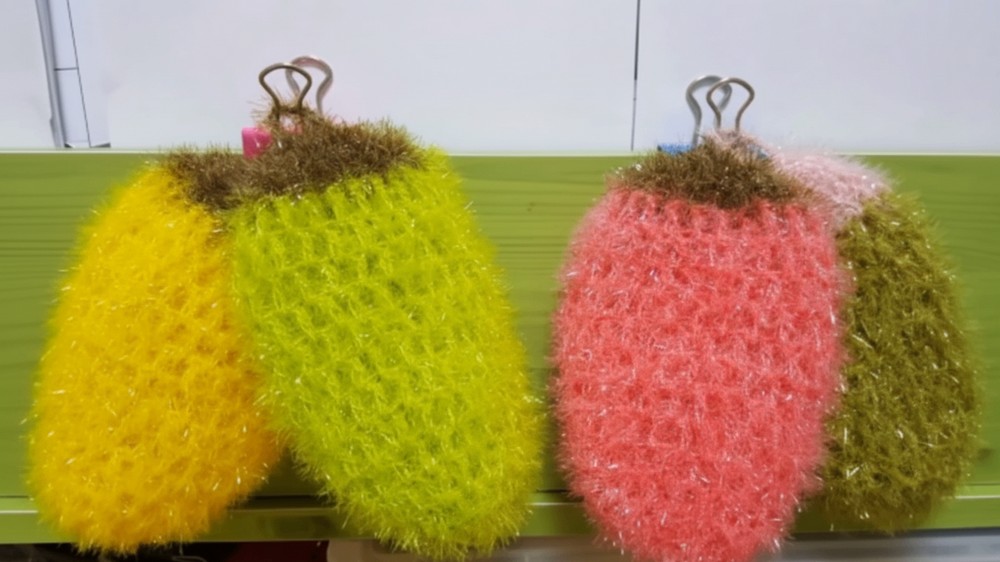 Polyester Scrubber Yarn: Typically “sparkly” or “wing” yarn (acrylic/polyester blend) designed for scrubbing dishes.