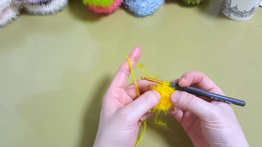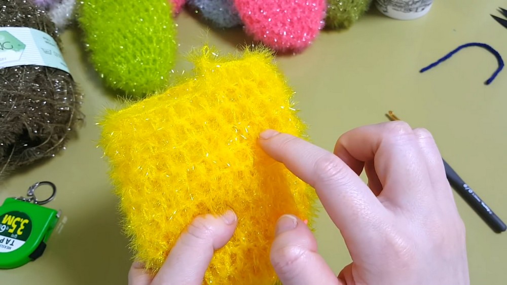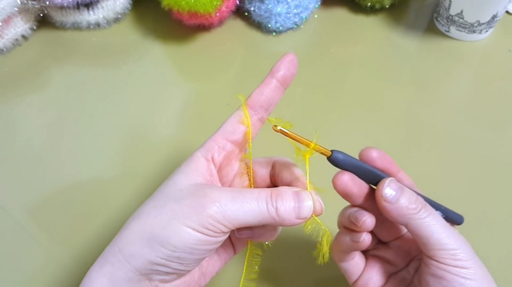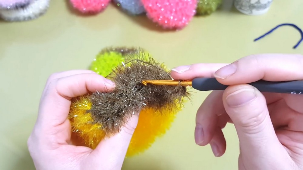 When working with “hairy” or “sparkly” scrubber yarn, feel for the stitches with your fingers rather than just relying on your eyes. The texture of the yarn often hides the “V” shape of the stitch, so inserting your hook where you feel a gap is often more accurate than trying to see it.