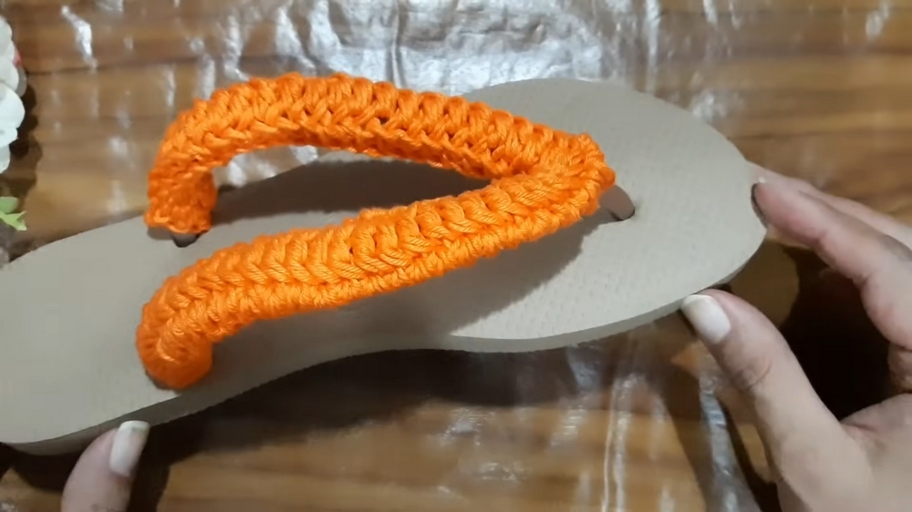 - Position the crocheted upper along the paths previously occupied by the original flip-flop straps.