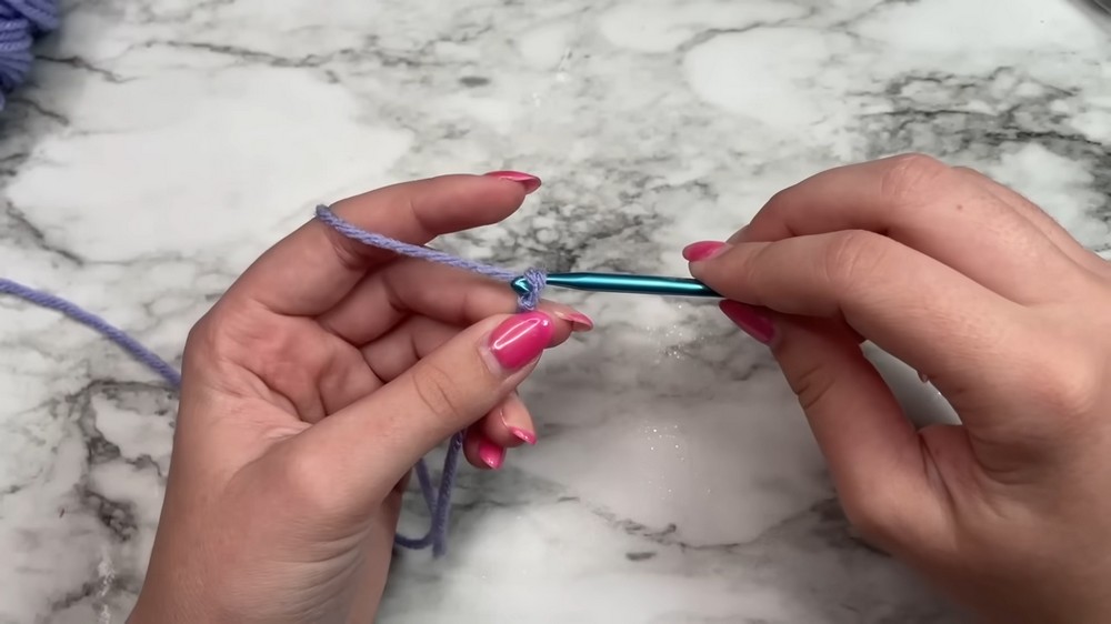 - Pull the long strand through the loop, tighten it, and place it on the crochet hook.