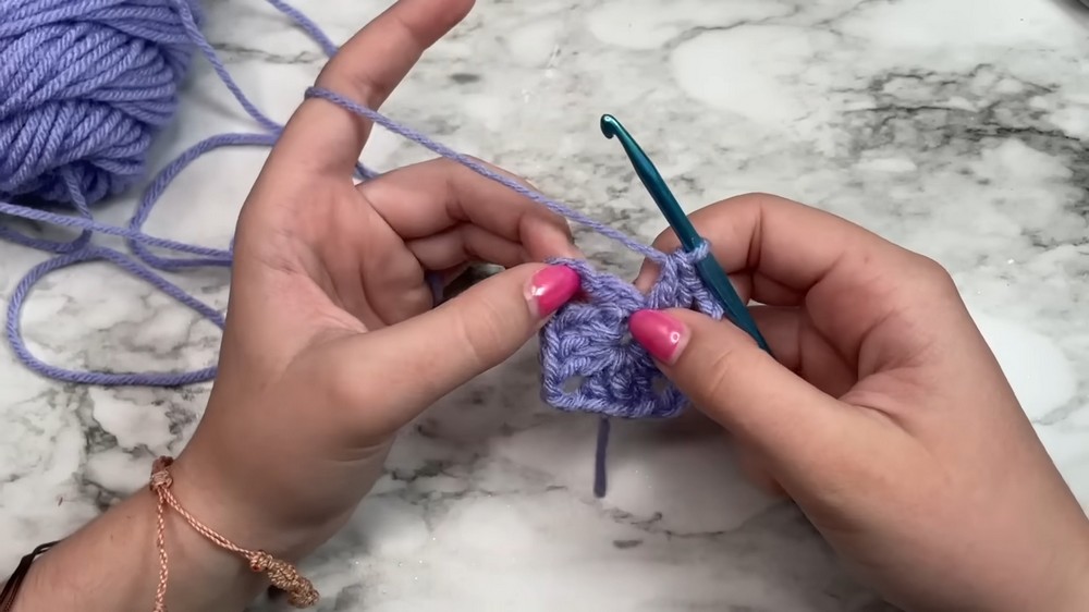 - Chain 3, repeat the process, and form clusters of double crochets (you’ll make a total of 4 groups of 3 double crochets, separated by chain-3 spaces).