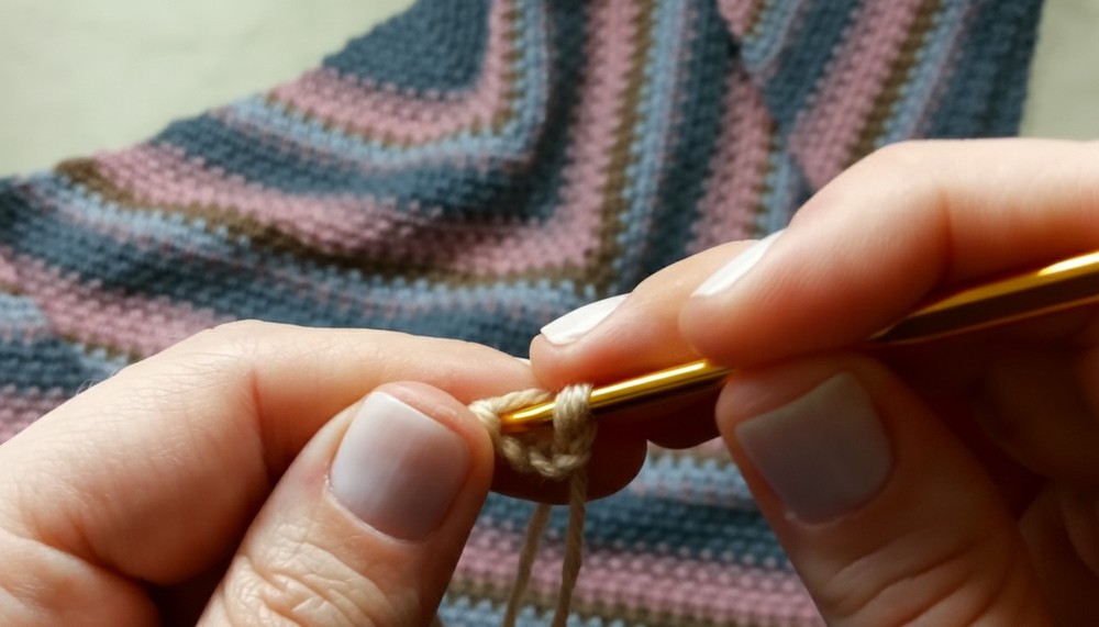 You continue repeating the simple two-step process (single crochet in the chain-one spaces and the corner increase) until your shawl reaches the size you desire. The repeating rows create a lightweight, airy fabric with a clean, growing triangular shape.