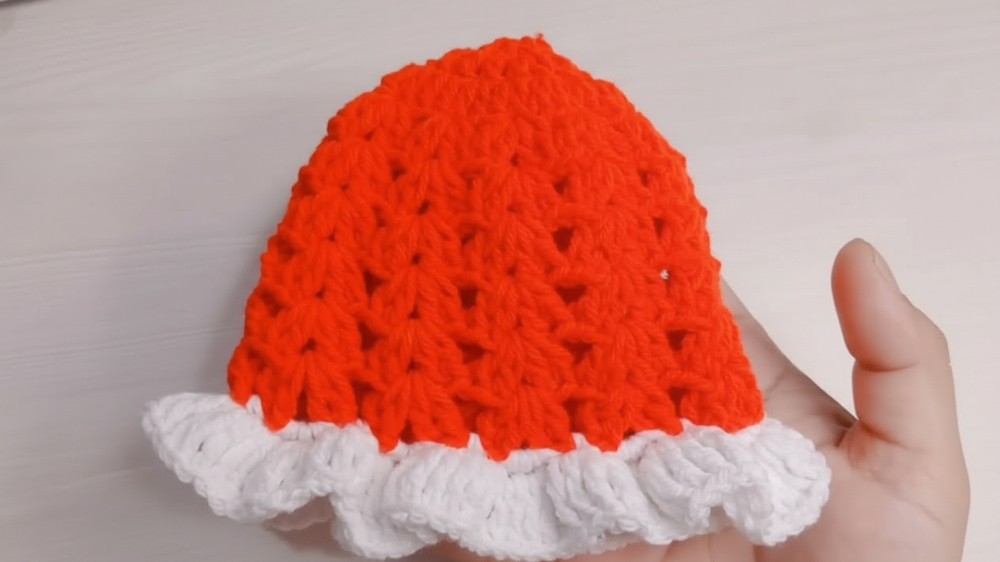 Shell Stitch Crown: The body of the hat is made using a simple shell stitch pattern (two double crochet, one chain, two double crochet) that creates a lacy, textured design.