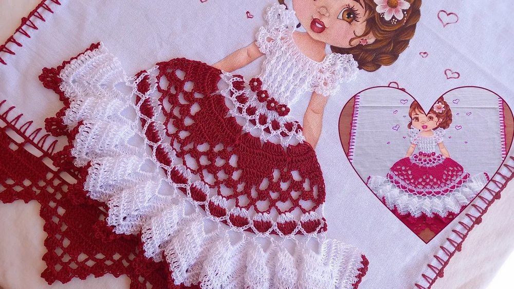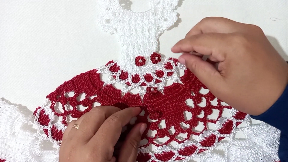 - Work diligently to add open spaces and heart-styled detailed stitching at the base of the dress.