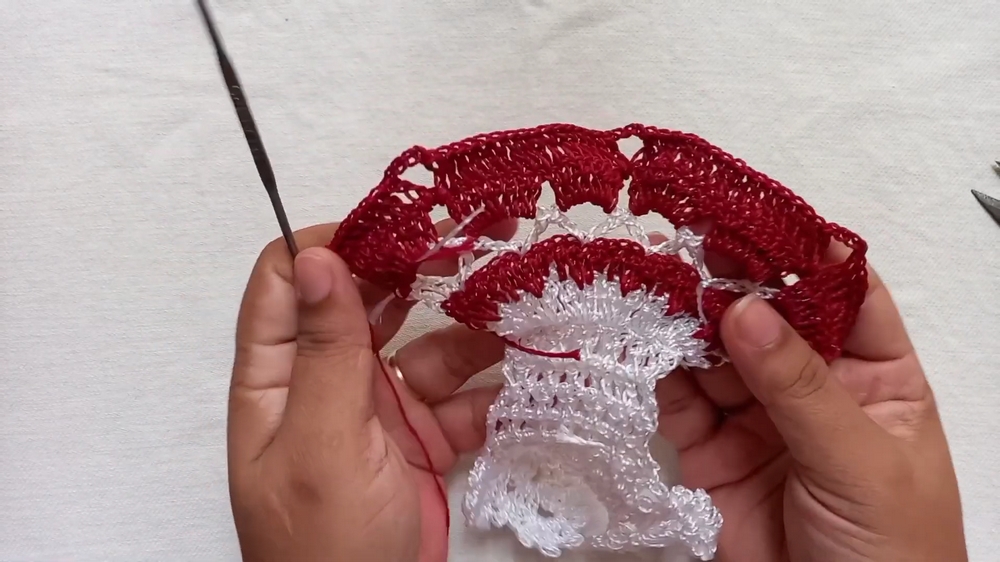 - Alternate colors (red and white) to form a contrasting pattern for the hem.