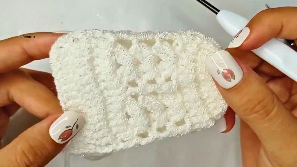 - Skip 2 stitches, crochet 2 double crochets, 2 chains, and 2 more double crochets into the same stitch to form the fan.
