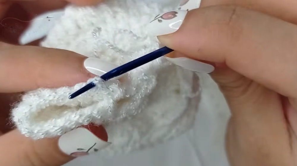 - Work double crochets to provide a snug but ample fit for the baby’s foot.