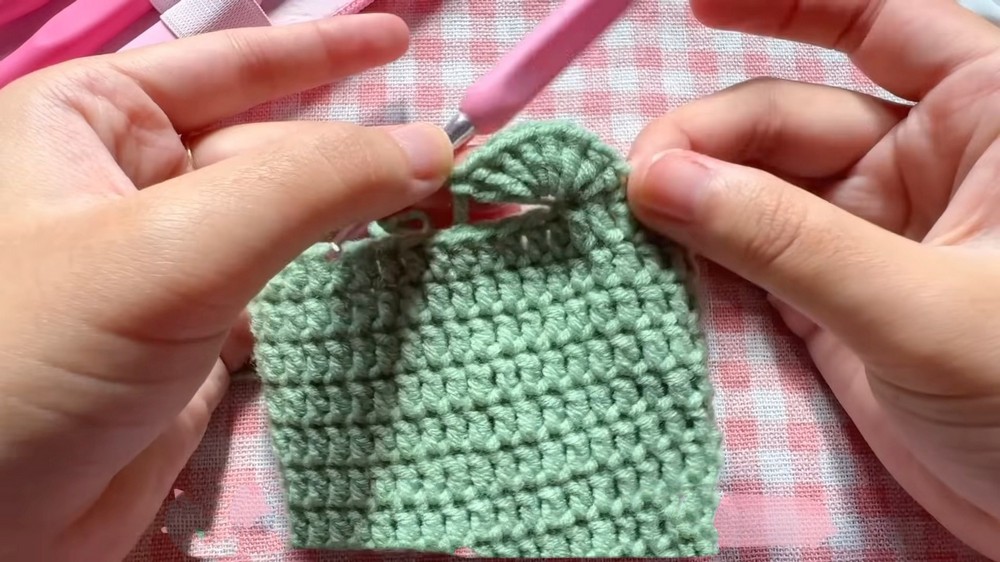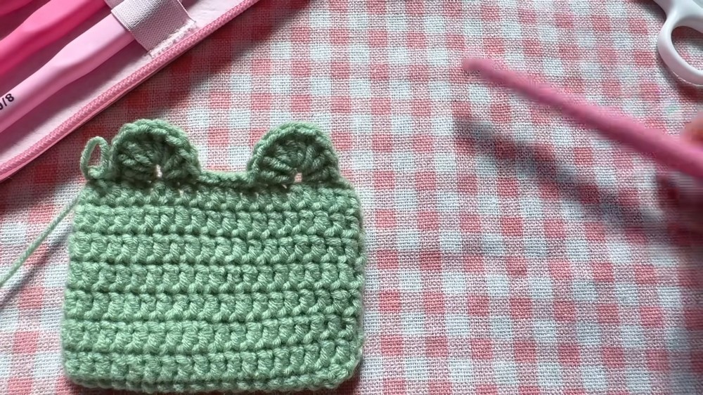 Crochets the ears (for a bear) or eyes (for a frog) on the top edge in specific positions.