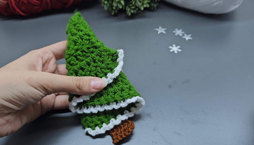 Toward the end, you switch to brown yarn to form the trunk, fasten off, and weave in the yarn ends neatly. Optional touches, such as small beads, sequins, or a tiny star on top, can add festive detail and make the tree even more visually appealing.