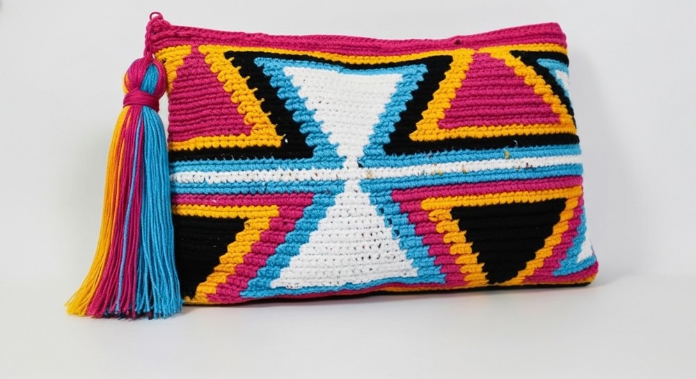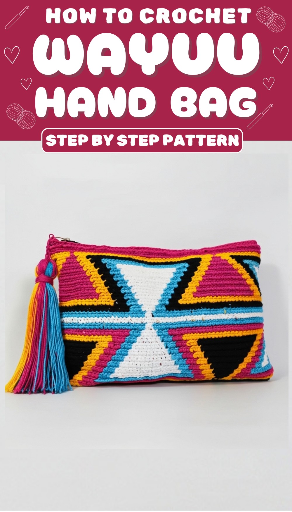 - Yarn: Thin handmade yarn popular for Guayu-style bags; you will need 2 rolls per color (colors used in this pattern: black, yellow, fuchsia, aquamarine blue, and white)