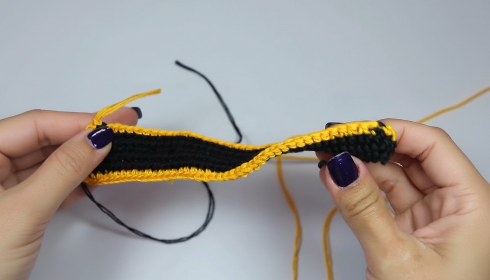 - At the end of the row, switch back to black yarn without cutting the yellow yarn.
