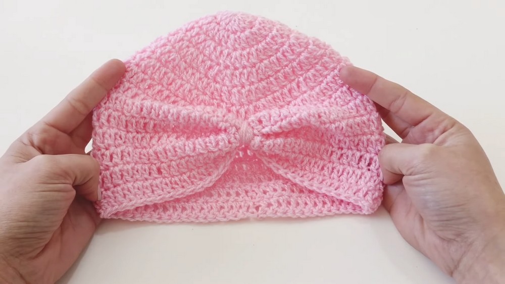 - Thread Through Half the Hat: Weave the yarn through half of the stitches in Round 6. Once complete, gently pull tight to form the fold at the front of the hat (turban effect).