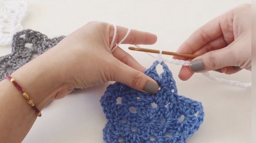 - After attaching a star, Ch 15 for spacing and attach the next star at its top corner using Sc.