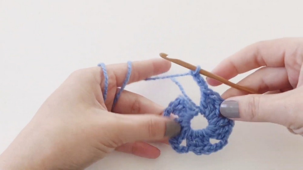 - Work 3 Dc, Ch 3, and another 3 Dc in the same space.
