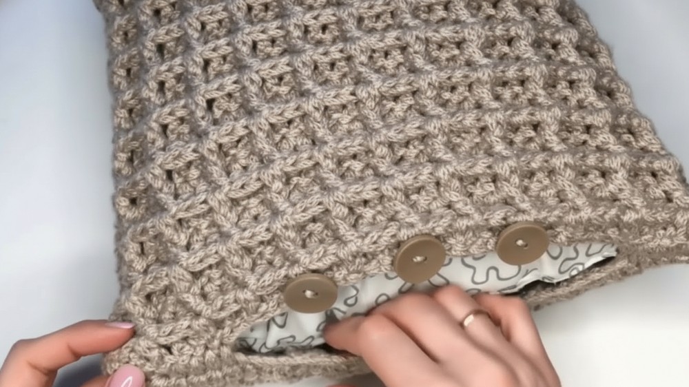 This French fry stitch pillow cover offers a lovely textured look with soft merino yarn and a practical button closure. With patience and attention to stitch count, you can create a cozy pillow cover perfect for any room.