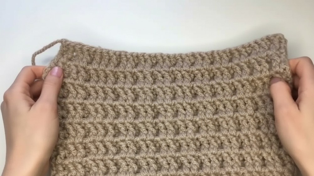 - Repeat the relief stitch pattern row, always starting with a relief stitch followed by one or two regular double crochets as before, adjusting for skipped loops in previous rows.