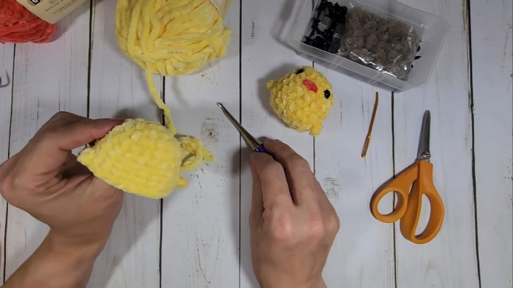 - Decrease Stitches: Gradually decrease stitches to close the chick’s bottom. Weave the remaining thread through the final stitches like a drawstring and tie securely.