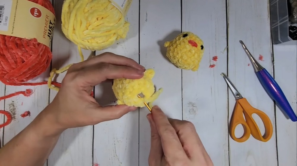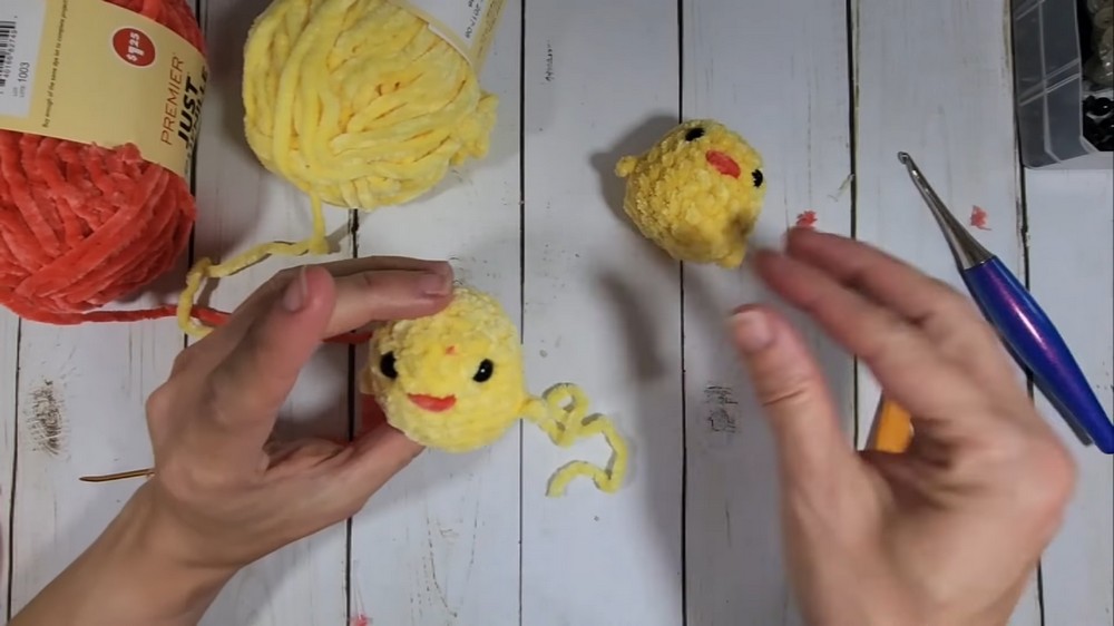 - Yarn: Premier Just Chenille (Yellow for the body, Salmon for the beak)