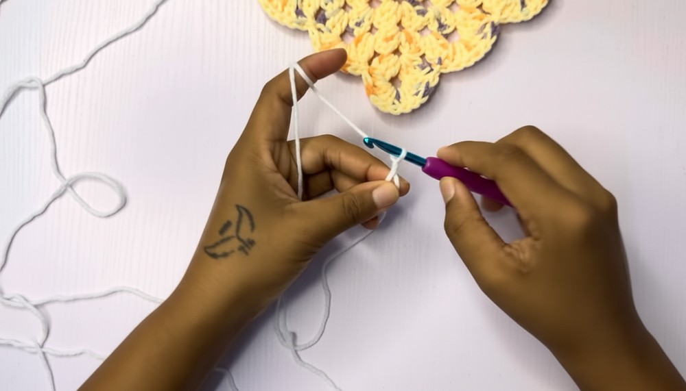 - Begin with a chain 3, create 2 double crochets to form a cluster.