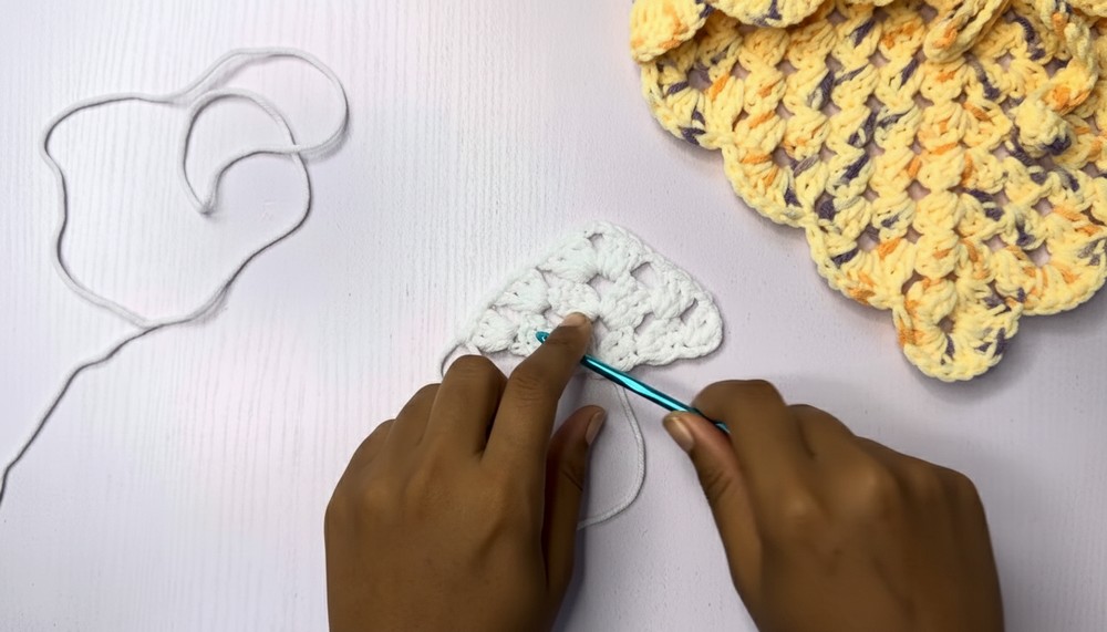- In the first stitch, create 2 more double crochets (this forms the first cluster).