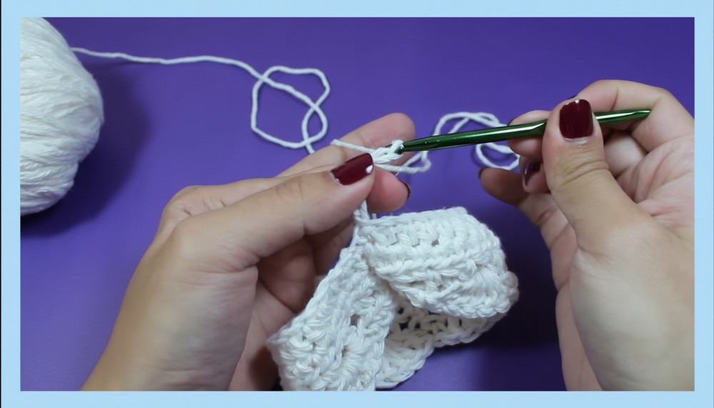 - Chain one. Turn your work. Place one hdc in each space created by the gaps (“yarn ears”).