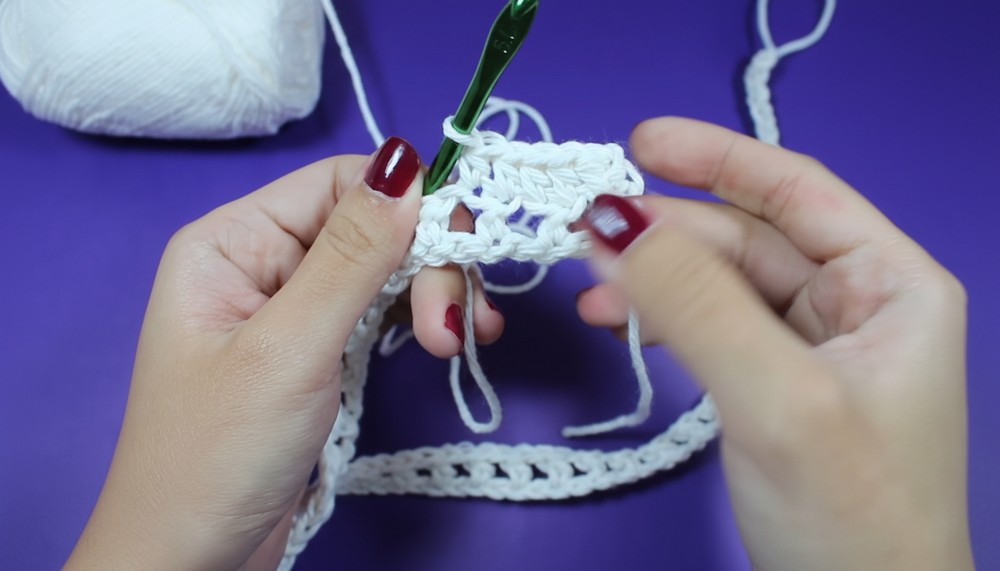 - Work single crochet stitches along the vertical sides of the top. Place two single crochets in each square.
