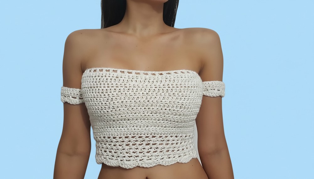Your off-the-shoulder crop top is now complete! The combination of breathable squares, an elegant fan border, and cozy sleeves makes this piece perfect for layering or standalone wear. Feel free to tweak the pattern to accommodate different sizes, add accents, or vary the length. Always remember to weave in loose ends securely to ensure durability