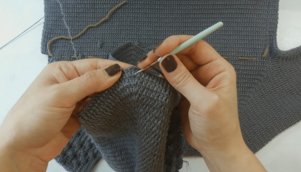 When attaching the yarn to start the sleeves, you will notice that the first row of double crochets under the armpit appears stretched out. You should use the starting yarn tail to sew and subtly tighten these stretched stitches on the first row to give the underarm a neater, more reinforced look.