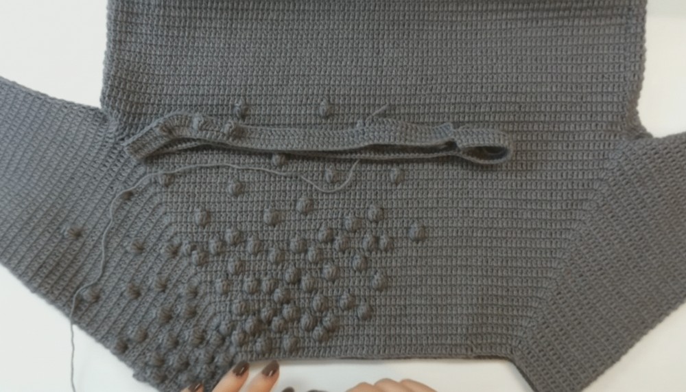 In the mid‑section, you continue alternating bobble rows with regular stitch rows (such as double crochet or half‑double crochet) to create alternating pockets of texture and smoothness — this helps shape the sweater body while retaining flexibility and softness.