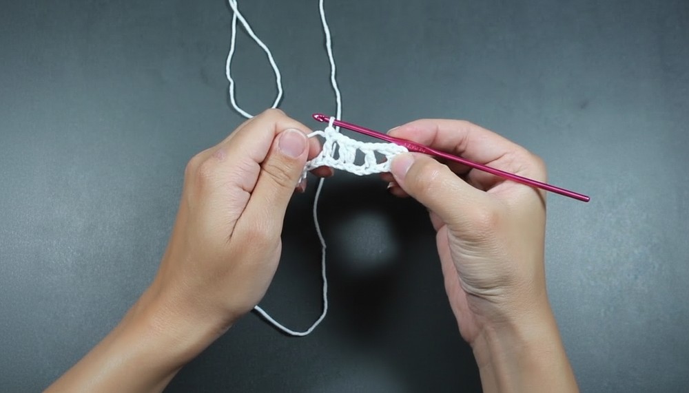 - Chain 1, skip 2 chains below, then create 2 DC in the same stitch.
