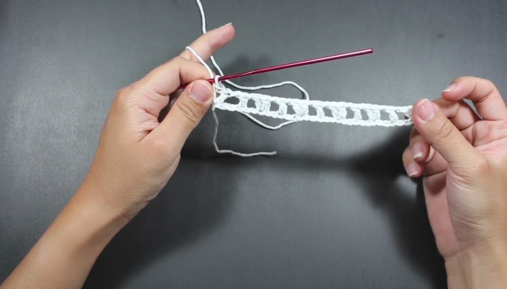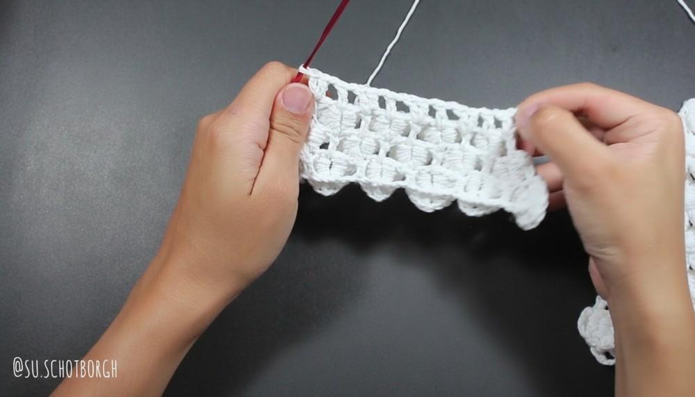 - Alternate 2 DC together with single DC, separated by chain spaces across the row.