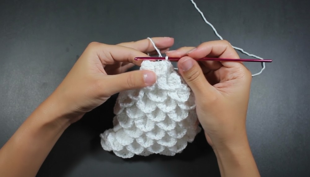 - Work 3 SC per row, focusing on the base of the scales or chain spaces.