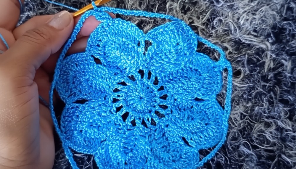 - On some rounds, work groups of 3 dc, chain 1, then 3 dc in same space, creating petal shapes.