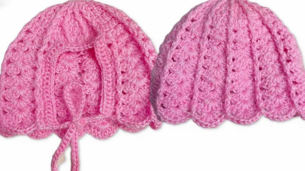 Textured Body: The main body of the bonnet features a decorative, open pattern using V-Stitches and Fan/Granny Stitches.