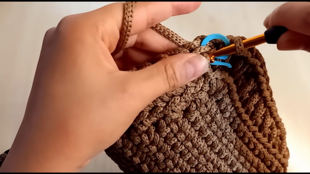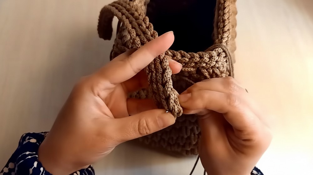 - Secure the ends of the strap with a knot. Insert the strap into the bag by passing it through the holes using a crochet hook.