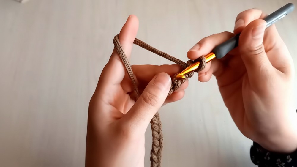 - Chain one, then make slip stitches along the opposite side of the starting chain. The ideal strap length should be between 30–35 cm.