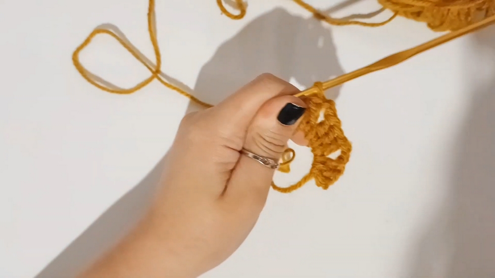 - Repeat (3 dc, ch 2) 5 more times for a total of 6 groups.
