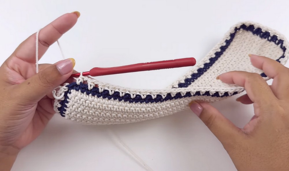- Row 4: Switch to another color and make single crochets in each stitch.