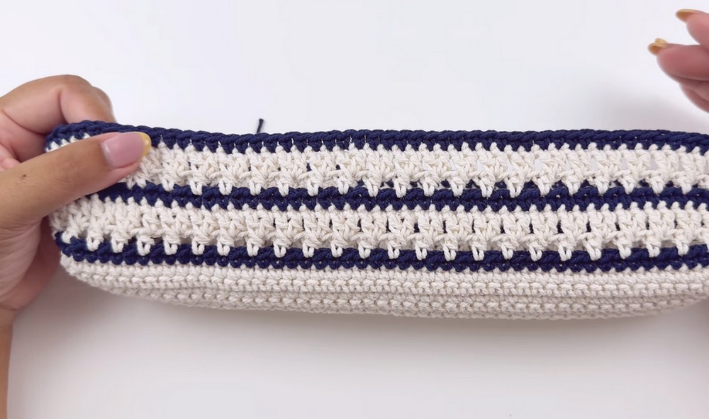 Repeat Rows 4–6 for the remaining body until the desired height is achieved. In this video, the creator completed 27 rows, creating 9 sets of the pattern. The final bag height measured about 23 cm.
