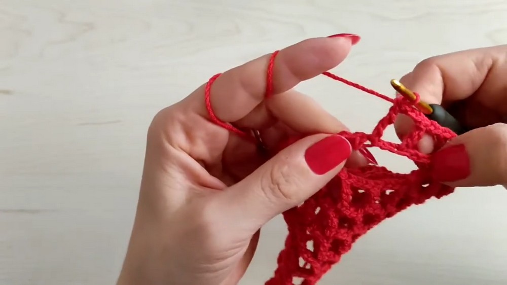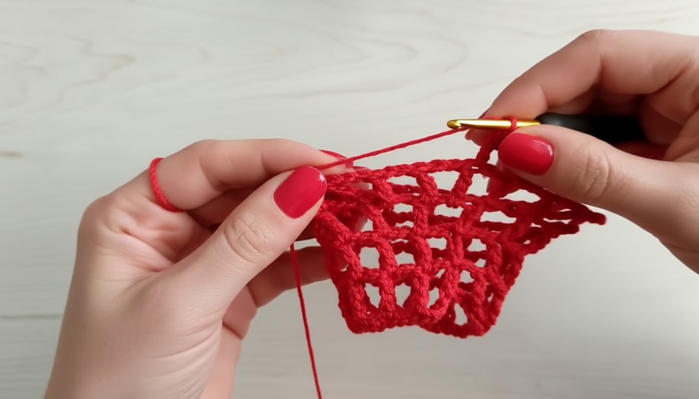 In the middle section you work a series of looping stitches and chain‑spaces (common in net‑style patterns) to build the mesh body of the glove, allowing for flexibility and that open, airy texture typical of net gloves.