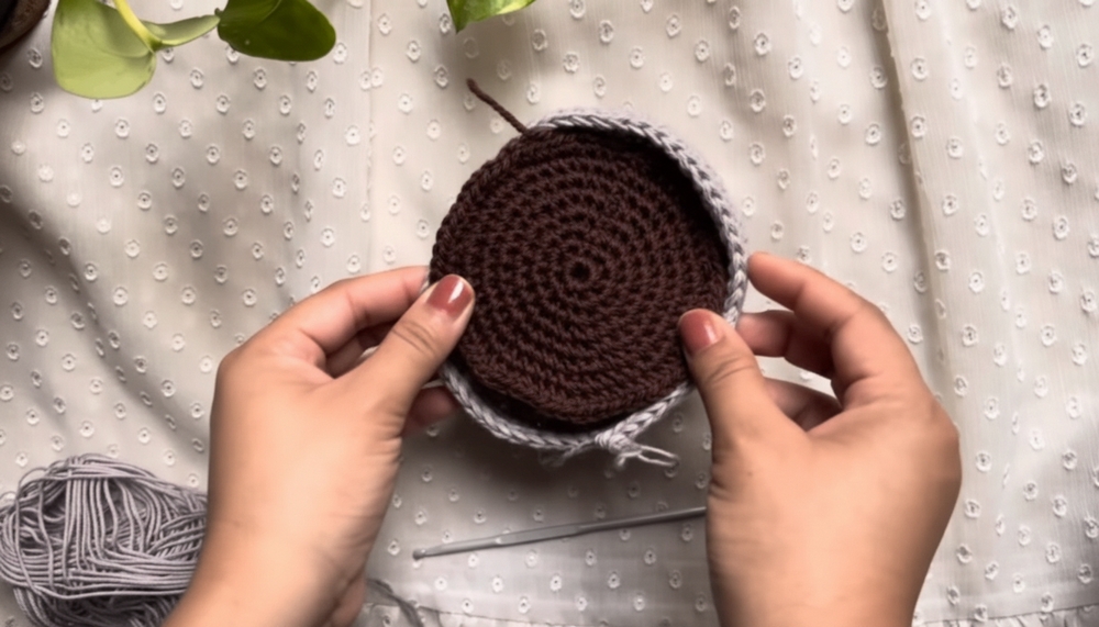 To crochet this hanging plant, you begin by making a tight, secure base that fits the bottom of your chosen pot.