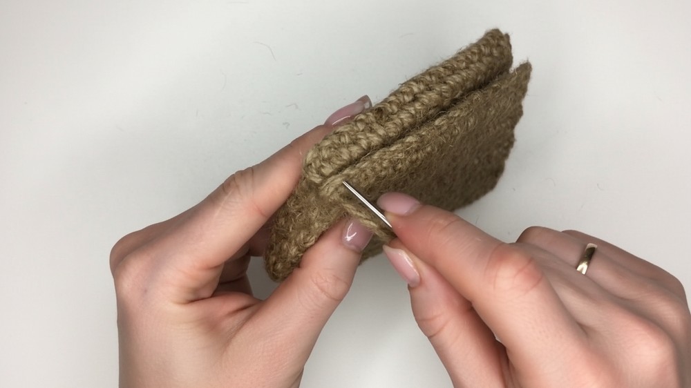 • Using a yarn needle and the yarn tail left from start, carefully weave and hide the tail inside the fabric, pulling the yarn through the posts of single crochet stitches on the wrong side.
