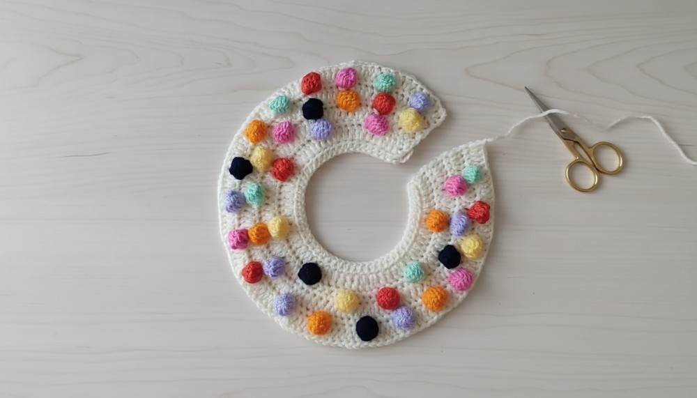 • Materials: You will need medium-thickness yarn (like Himalaya Elit Baby) for the main collar color and small amounts of scrap yarn in various bright colors for the “Bonibon” dots. Use a 3 mm or 3.5 mm crochet hook.
