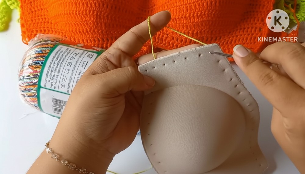 - Sew straps securely to edges of the bra cup cover using yarn needle.