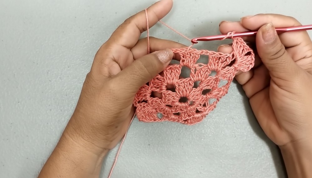 - Row 2: Begin with a slip stitch to the first chain space.