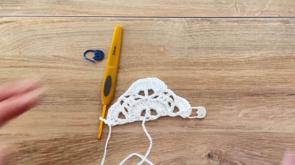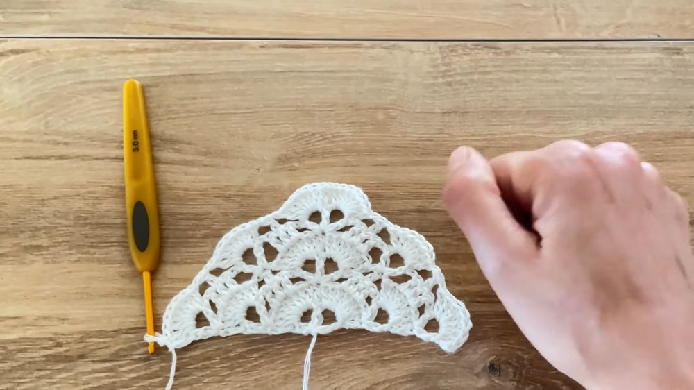 Two-Row Repeat: The entire body of the shawl consists of alternating between an “increase row” (V-stitches and triple groups) and a “fan row” (7-double crochet shells).